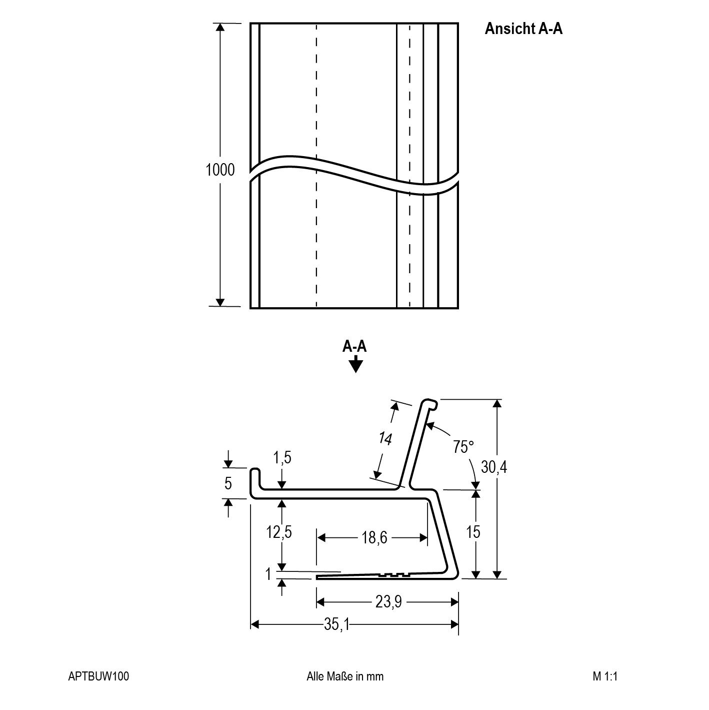 Gipsvægsprofil APTBU af aluminium til lysbue, vægmonteret Aluminiumsprofilen APTBU muliggør indirekte belysning via væggen. Den er velegnet til gipsplader med en tykkelse på 12,5 mm og LED-strips op til 12 mm brede og maks. 30 W pr. meter. Når LED-strimlen er installeret, er den ikke længere synlig fra rummet. Den nederste kant af profilen er fyldt ud over et stort område med gipspladen og stofindsatsen. Mellemrummet mellem gipspladen og loftet bør være maks. 8 cm. Profilens kant kan males i samme farve som den omgivende væg/loft/panel. Lysets effektive frie udstrålingsvinkel er 120°; jo større afstanden til væggen er (anbefaling: 6 til 15 cm), jo højere er den oplyste del af væggen.