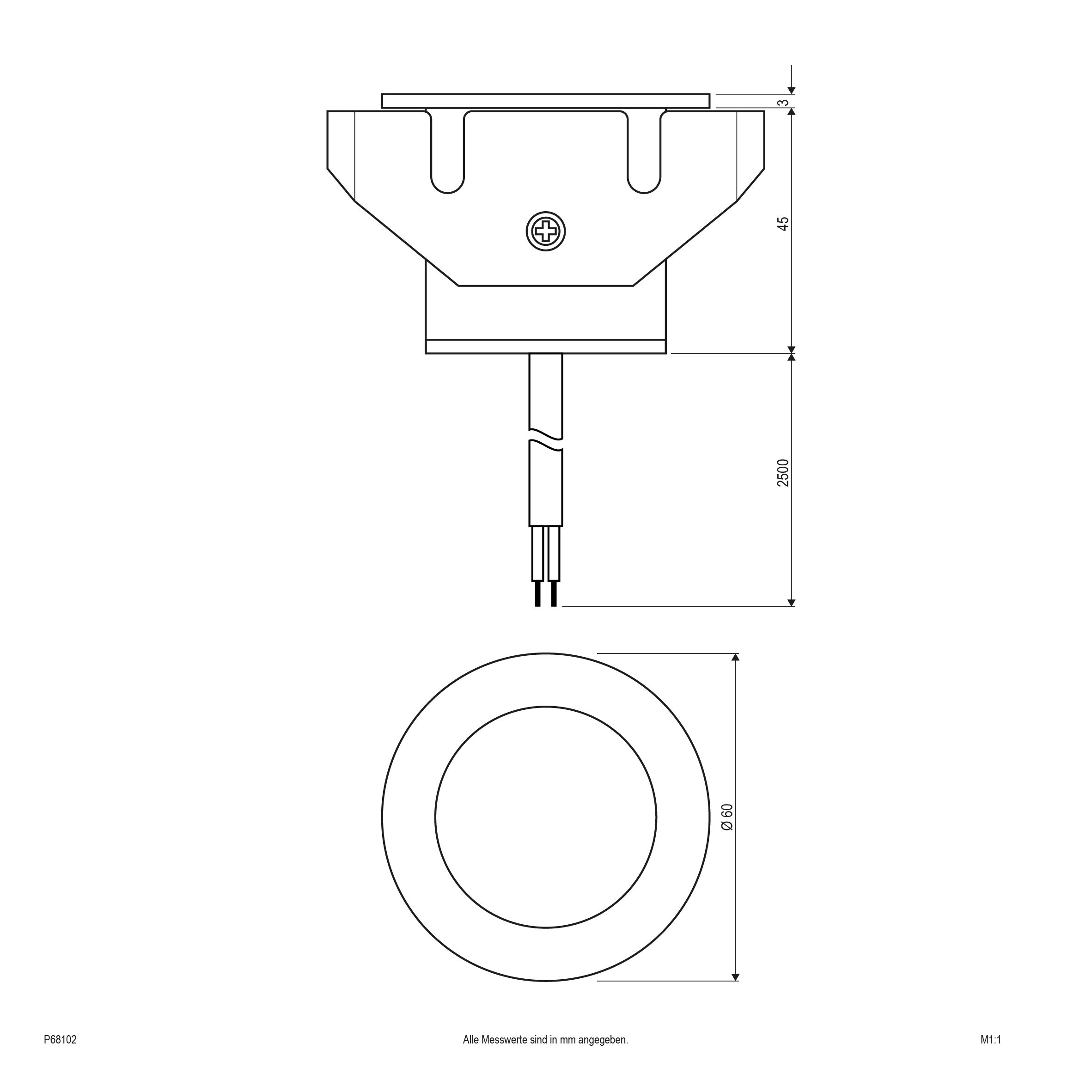 Fremstillet af rustfast V4A rustfrit stål: Rund LED-gulvindbygning P68102, 350 mA, 3.000 K, IP68Da LED-gulvindbygningsarmaturet P68102 er beskyttet mod kontinuerlig nedsænkning, kan det også bruges under vand. Desuden kan den belastes med op til 1.000 kg og kan også køres med en maksimal hastighed på 20 km/t. Den giver således et godt indtryk i hele det udendørs område. Det rustfrie hus af V4A rustfrit stål af høj kvalitet er kronet af en glasrude. Sidstnævnte beskytter de integrerede lysdioder, der udsender varmt hvidt lys. P68102 leveres med et 300 cm langt forsyningskabel og åbne ledningsender. En passende driver kan vælges separat via tilbehør. Tekniske egenskaber / karakteristika- fremstillet af rustfast V4A rustfrit stål- lysfordeling: symmetrisk- mellembred fordeling: 25°- max. belastning 1.000 kg, kan køres med op til 20 km/t- IP68-beskyttelse: beskyttet mod kontinuerlig nedsænkning op til en meters dybde- nominel strøm: 350 mA- 300 cm langt forsyningskabel med frie ledningsenderBemærk: En passende driver er absolut nødvendig for driften (se tilbehør).