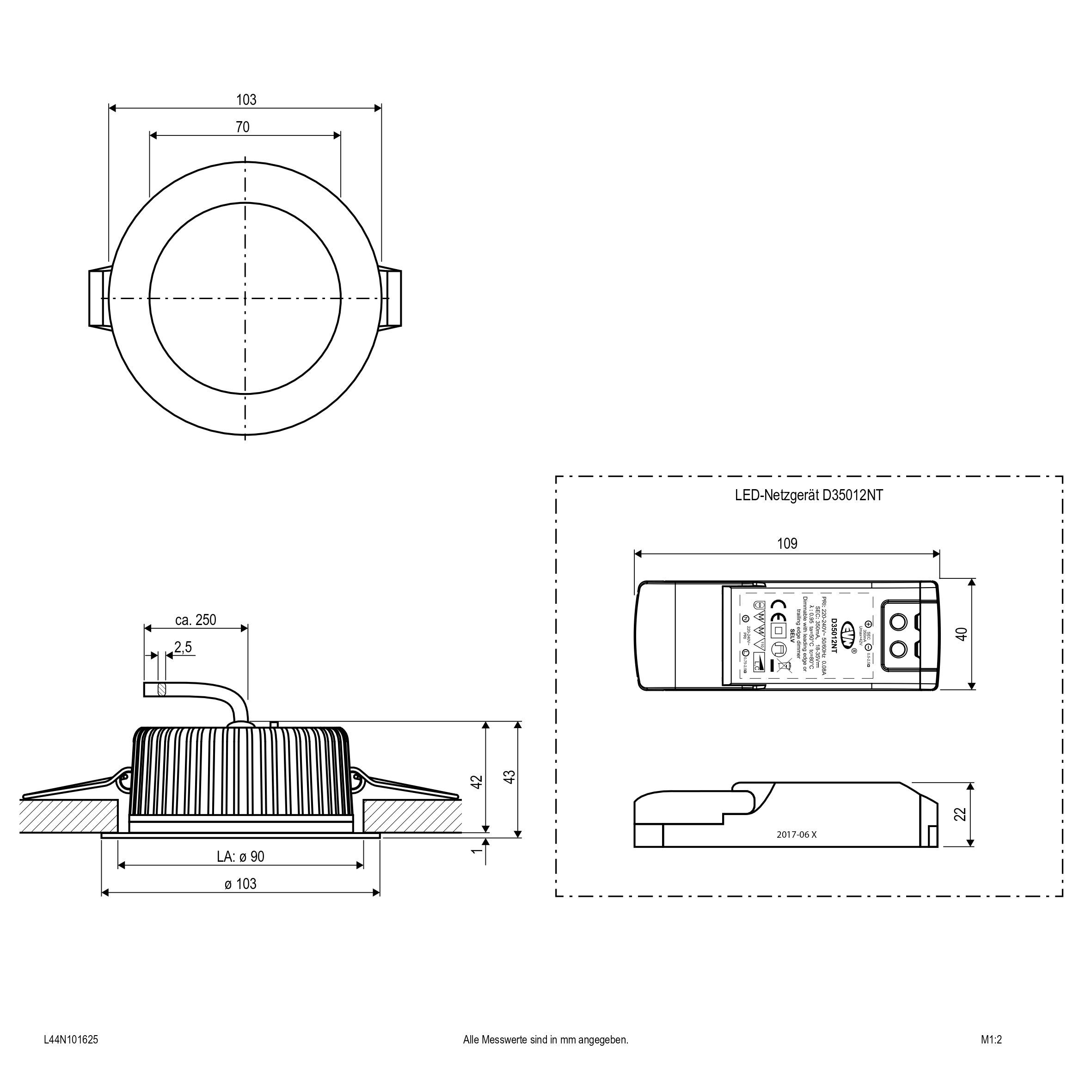 Rundt LED-indbygningsarmatur Solido85 med driver, 220-240V/AC, farvetemperatur justerbar, IP44Huset på LED-indbygningsarmaturet Solido85 er lavet af aluminium. Det indbyggede LED-modul er dækket af opalhvid plast, hvilket sikrer en blændfri og homogen belysning. En passende driver er allerede inkluderet i leveringsomfanget.På bagsiden kan farvetemperaturen indstilles via en kontakt før installationen. Her kan du vælge mellem varm hvid (3.000 K), universalhvid (4.000 K) og dagslys (5.700 K). Desuden kan intensiteten af Solido85 dæmpes eksternt via fasestyring.Tekniske egenskaber / karakteristika- driver inkluderet- farvetemperatur justerbar (3.000 K / 4.000 K / 5.700 K)- eksternt dæmpbar via fasestyring- lysfordeling: symmetrisk- bred fordeling: >80°- temperaturområde: -20 til 40 °C- gennemsnitlig levetid: 50.000 timer- spænding: 220 til 240 V / AC