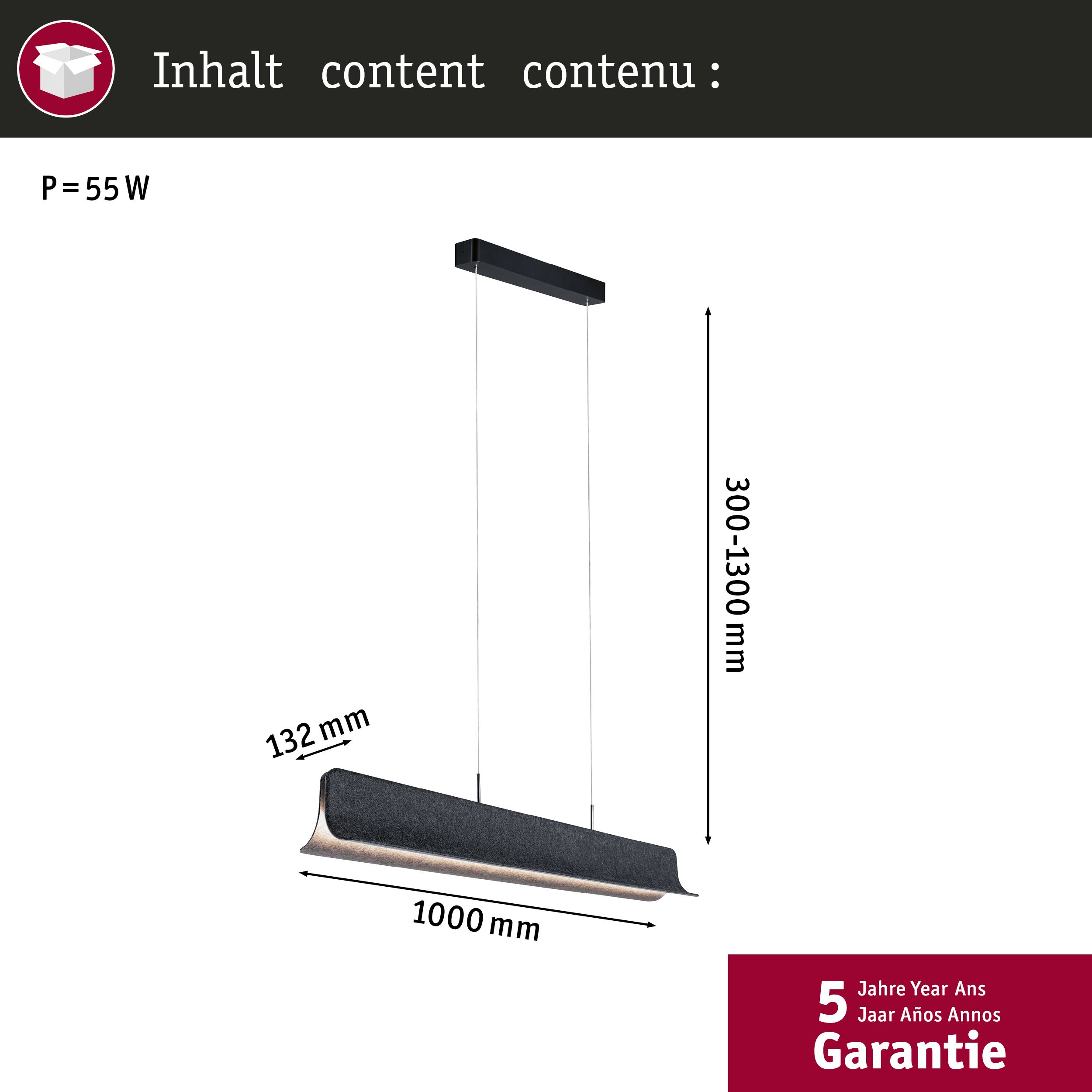 Lang Noyan LED-pendel med filtskærm i antracit og 3-trins dæmpningsfunktion Noyan LED-pendlen kombinerer moderne design med funktionel lysteknologi. Lampeskærmen består af to lange filtelementer, der er fremstillet af mindst 60 % genbrugsmateriale. Filtelementerne er trukket udad på undersiden, og det varmhvide LED-modul er placeret mellem dem. Ved hjælp af en almindelig vægkontakt kan lyset dæmpes i tre trin (100 %, 50 %, 25 %) ved at tænde for Noyan hurtigt efter hinanden. Det tidligere aktive lysstyrkeniveau er tilgængeligt igen, når lyset tændes igen (hukommelsesfunktion). Filtmaterialet har en lyddæmpende effekt og understøtter dermed en god rumakustik.