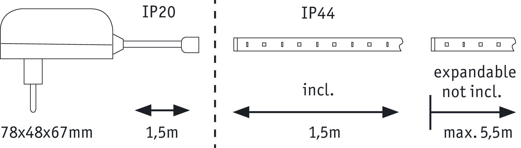 - Levering inklusive forsyningslinje og plug-in transformer